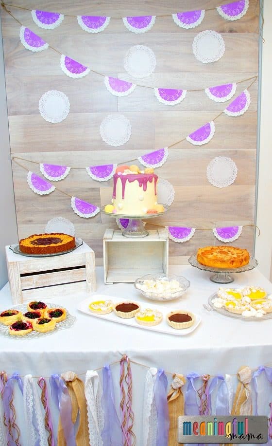 Use purple ribbons and lace runners to tie the entire theme together beautifully. The soft color palette is ideal for welcoming a sweet baby girl during the blooming spring season.