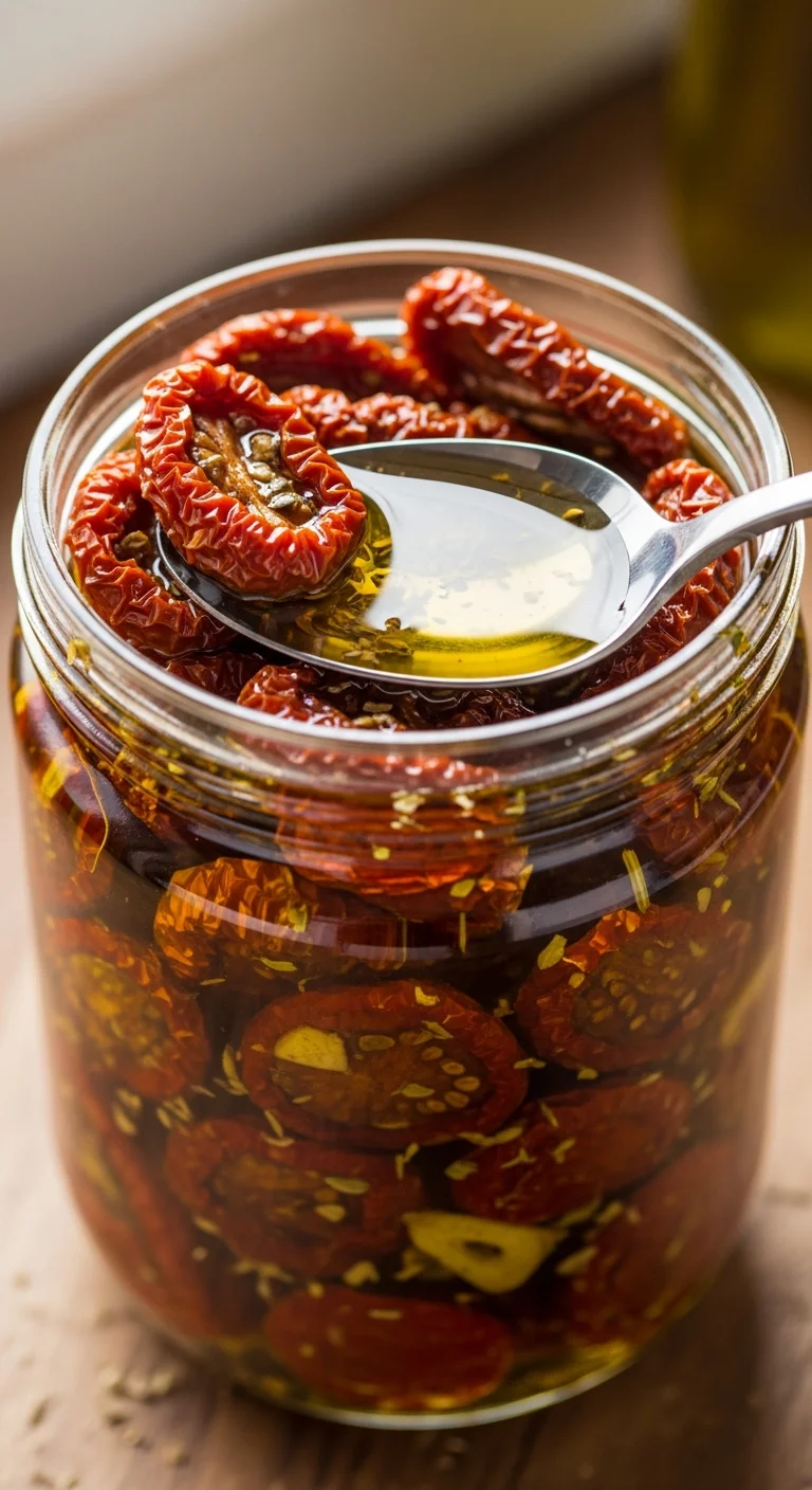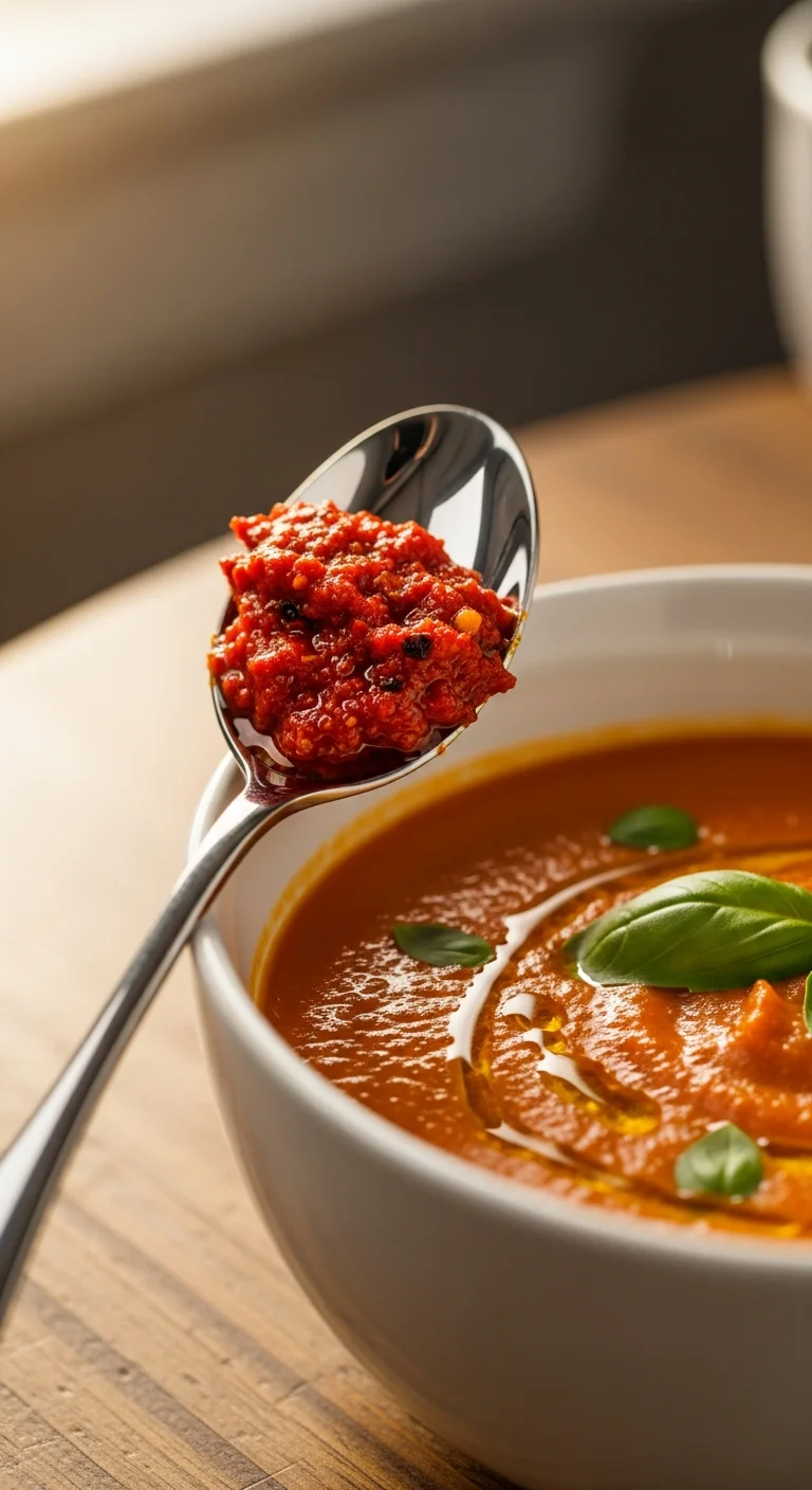 Instead of plain oil, use the oil preserved with sun-dried tomatoes. This oil is infused with intense tomato flavor, garlic, and herbs, intensifying the overall brightness of the soup.