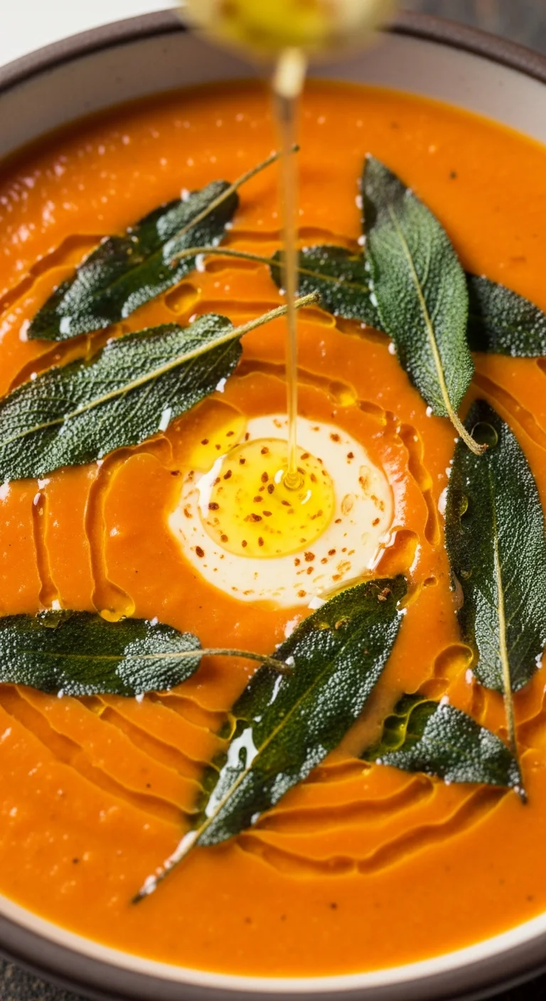 3. Ladle the hot soup into bowls. Drizzle the brown butter and scatter 2-3 crispy sage leaves over each serving immediately before serving.