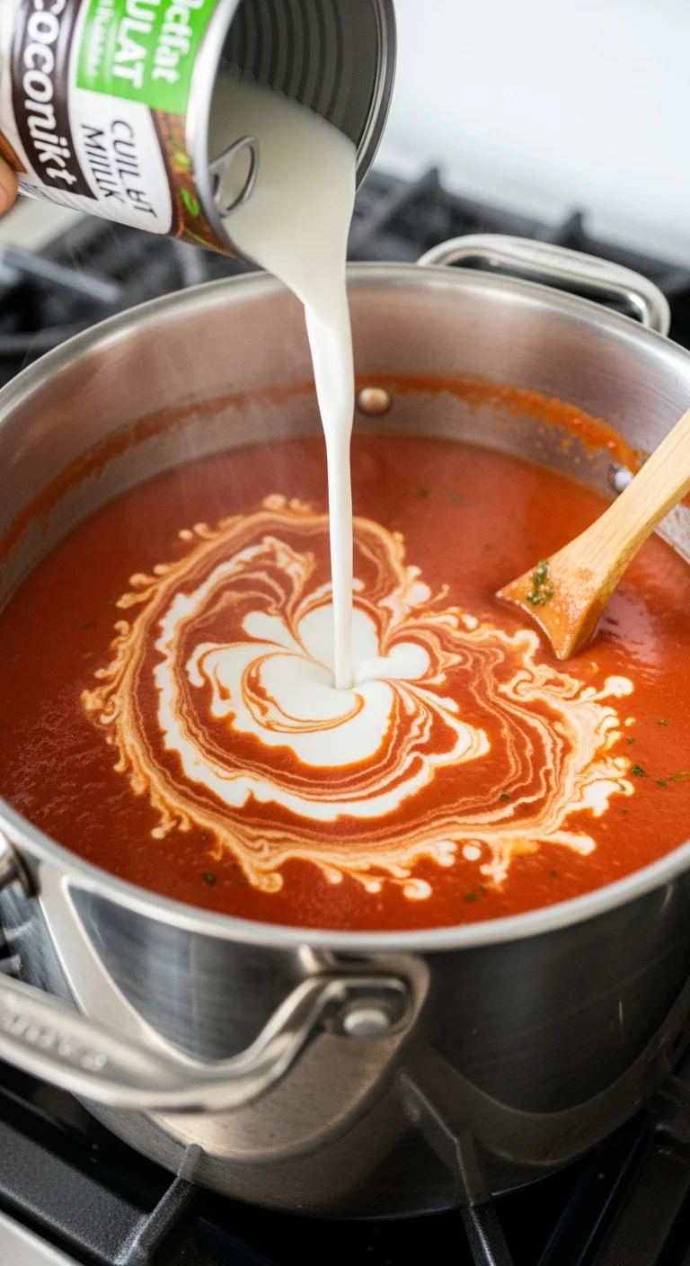 1. Once the soup is puréed and ready, stir in the full-fat coconut milk.