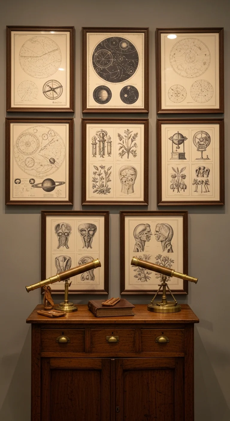 Beyond classical paintings, incorporate educational and geographical wall decor. Old astronomical charts, detailed botanical illustrations, or sepia-toned world maps communicate a love for knowledge and exploration. Frame these in thin, matte black frames or simple dark wood. Avoid modern glossy prints. The goal is to make the room feel like the personal study of a 19th-century academic, obsessed with cataloging the known world and its historical context.