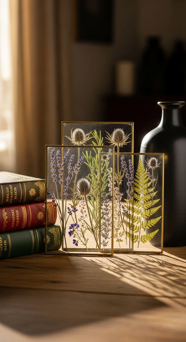 While Dark Academia isn’t overly flowery, it appreciates the preservation of nature. Use dried florals rather than fresh ones—think bundles of dried lavender, pressed ferns, or thistles arranged in dark ceramic or tarnished silver vases. Avoid bright greens. This detail symbolizes preservation and the study of the natural world, reinforcing the scholarly environment. A small terrarium featuring slow-growing mosses or air plants can also add a touch of low-maintenance, dark naturalism to the corner.