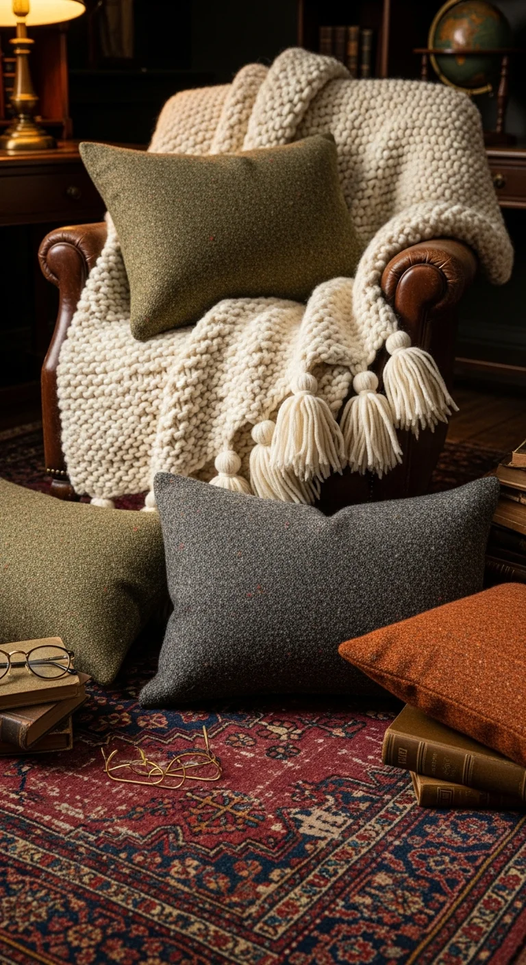 The sense of warmth and coziness is crucial, especially against the backdrop of dark colors and cold stone (or faux stone). Utilize heavy, tactile fabrics. Drape a thick wool or cable-knit throw over your armchair, and use cushions made from tweed, herringbone, or subtle tartan patterns. Rugs should be Oriental or Persian in deep, faded colors, layered sometimes for extra depth. These textiles add necessary softness, insulating the small space both visually and physically for those long nights studying ancient texts.