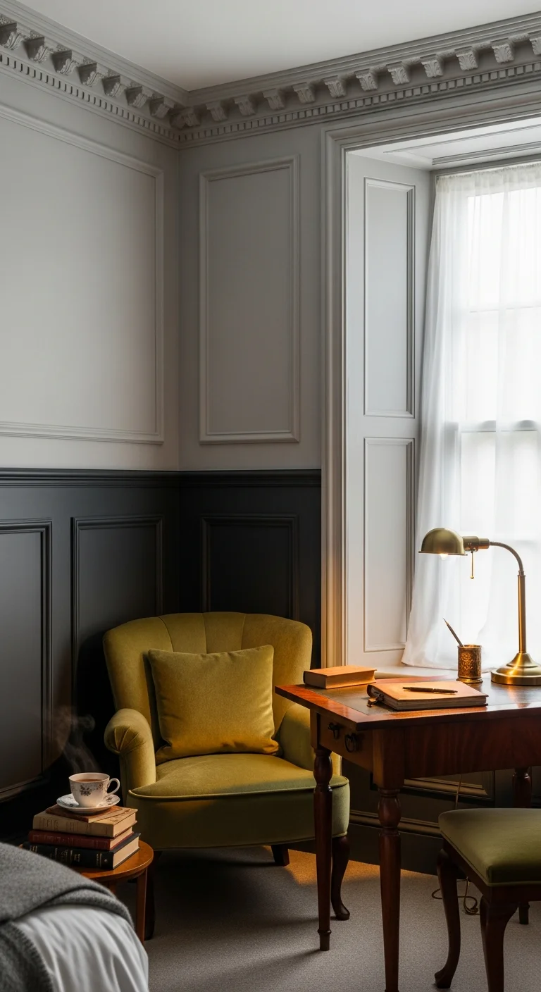 If you live in a modern home, you can incorporate Dark Academia architecture through simple additions. Install DIY picture frame molding, wainscoting, or even faux fireplace mantels painted in a deep shade. Use dark wood stain on window casings to create contrast. These details provide structural elegance and mimic the stately interiors of historical universities and libraries. Even a simple change in baseboards to a more ornate profile can significantly elevate a small reading nook’s authenticity.