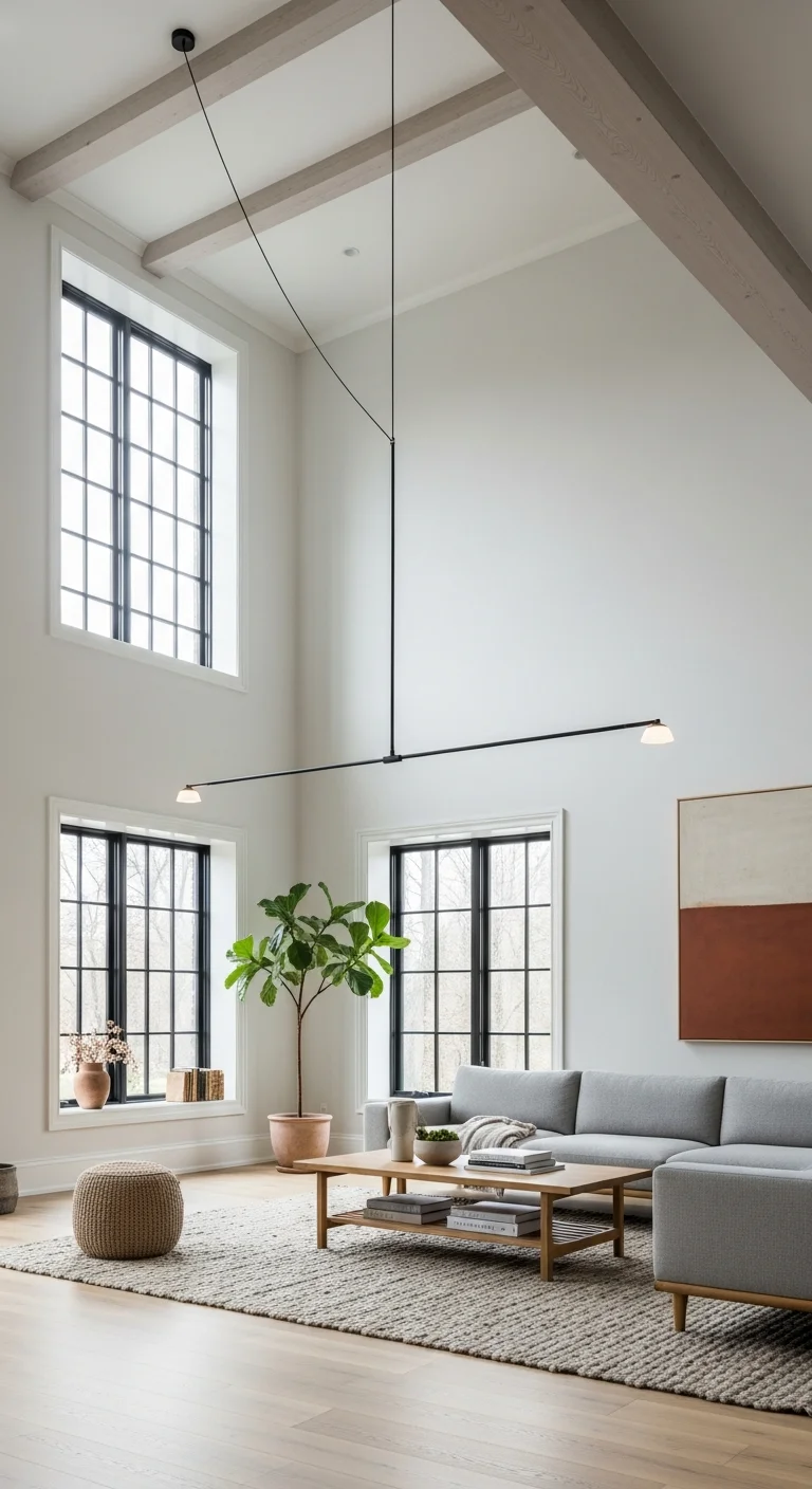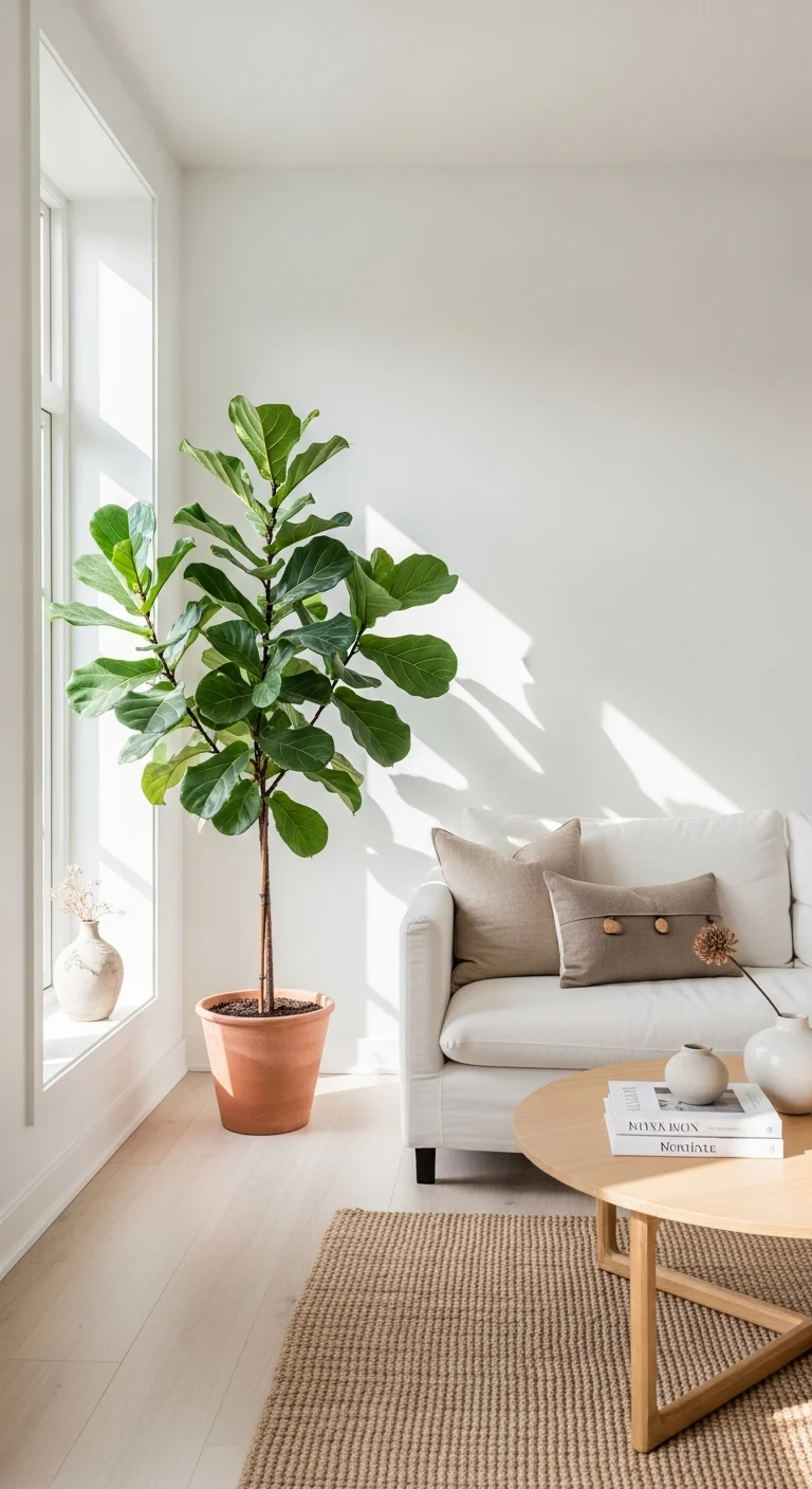 Greenery is essential for bringing life and connecting the interior to the natural world. Large, simple potted plants, such as ferns, snake plants, or Fiddle Leaf Figs, introduce vibrant color while maintaining a clean aesthetic. Place them in minimalist terracotta or ceramic planters. The vertical lines of tall plants draw the eye upward, naturally emphasizing the height of the ceiling and contributing significantly to the overall airy feeling.