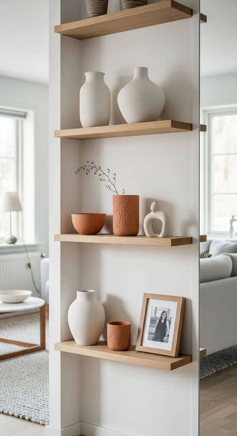Instead of heavy wall units, utilize open shelving to maintain visual flow and showcase personality. The key is extreme curation; only display meaningful items like simple ceramic vases, selected books, or small plants. Ensure there is significant negative space around each item to keep the shelving from looking cluttered. Utilizing high-quality options like 13 Floating Shelves for Ultimate Vertical Storage Wins supports vertical organization while preserving the wall’s expansive feel, which is essential for airiness.