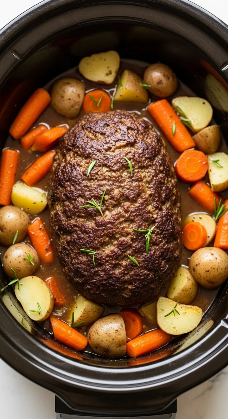 Maximize the slow cooker space by adding robust, slow-cooking vegetables around the perimeter of the loaf. They absorb the flavorful juices and broth.