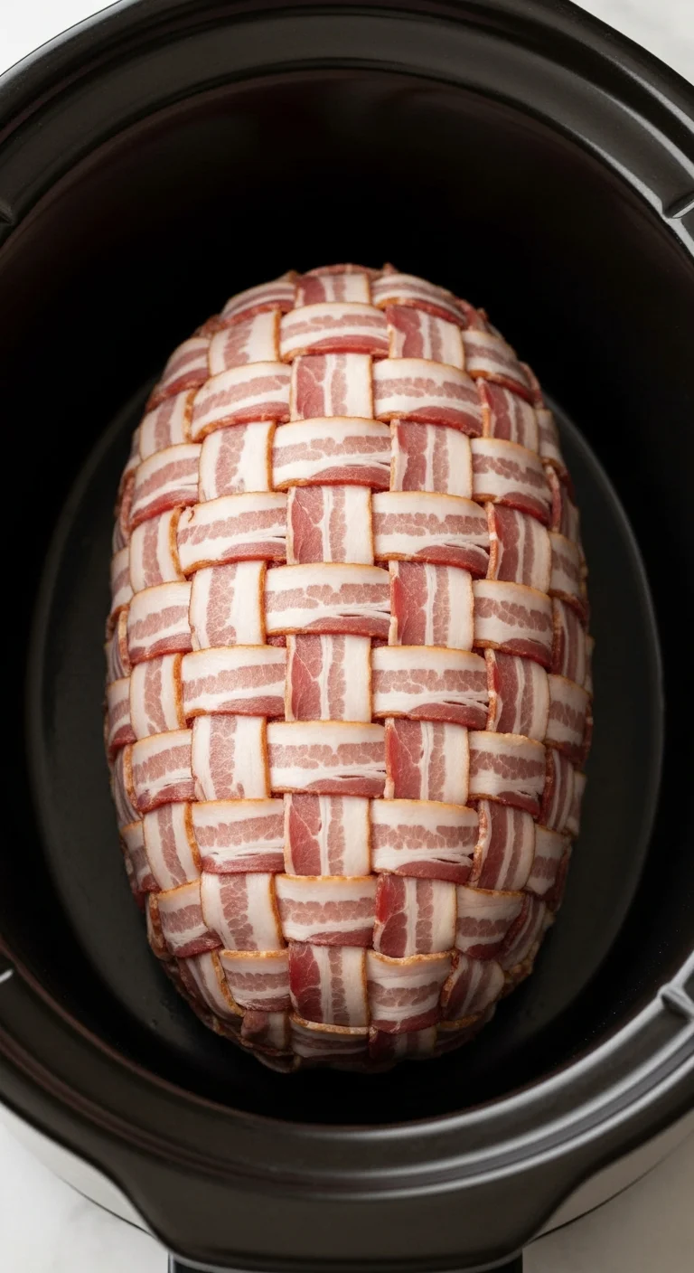 4. Place the loaf directly into the slow cooker, bacon side up.