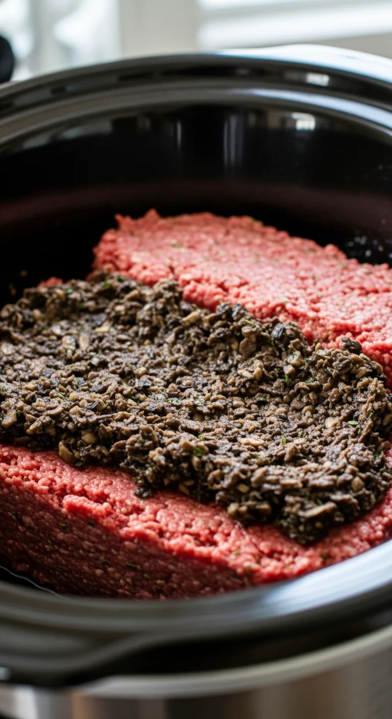 2. Divide the bison mixture in half. Press one half into the slow cooker bottom.