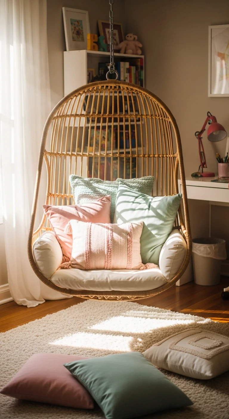 Swinging furniture introduces a fun, relaxed element and offers a cozy spot for reading or listening to music. Hanging basket chairs or indoor hammocks provide a unique, gravity-defying alternative to standard armchairs.