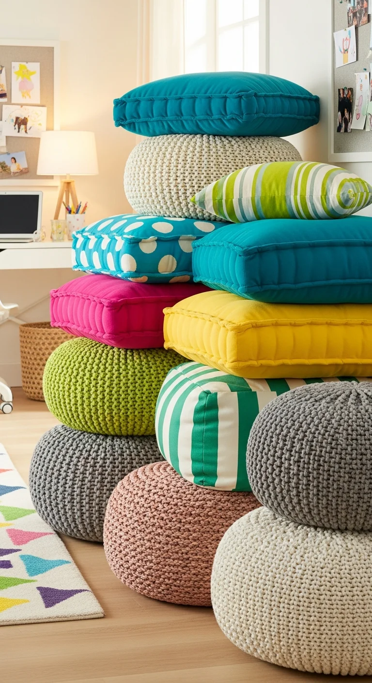 They are lightweight and easily moved, adapting quickly when floor space is needed for activities. This relaxed, comfortable seating arrangement encourages casual interaction and provides a cozy alternative to sitting on the bed or floor.