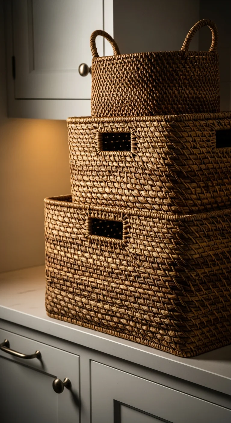 Woven baskets are perfect for bridging the gap between cabinet tops and the ceiling, offering a cozy, rustic feel. Choose oversized, varying textures like rattan or seagrass. They also provide valuable hidden storage for rarely used items, such as seasonal dishware or extra napkins. Grouping them in odd numbers creates visual balance and complexity, instantly elevating the space above your cabinetry. This technique works exceptionally well in transitional or cottage-style kitchens, adding necessary warmth and organization.