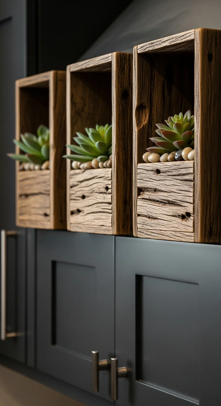 Incorporating simple, rectangular wooden boxes or crates, perhaps stained dark or lightly painted, adds immediate warmth. These items introduce a strong horizontal line, helping to tie the cabinet tops together visually across long spans. Use these sturdy items to elevate smaller decor pieces or fill awkward, empty gaps. They naturally enhance spaces requiring more texture and a rustic feel. If you love the look, consider how these complement items like These ROMGUAR CRAFT Rustic Shelves Are the ‘Perfect’ Finishing Touch for Any Bedroom in other areas of your home.