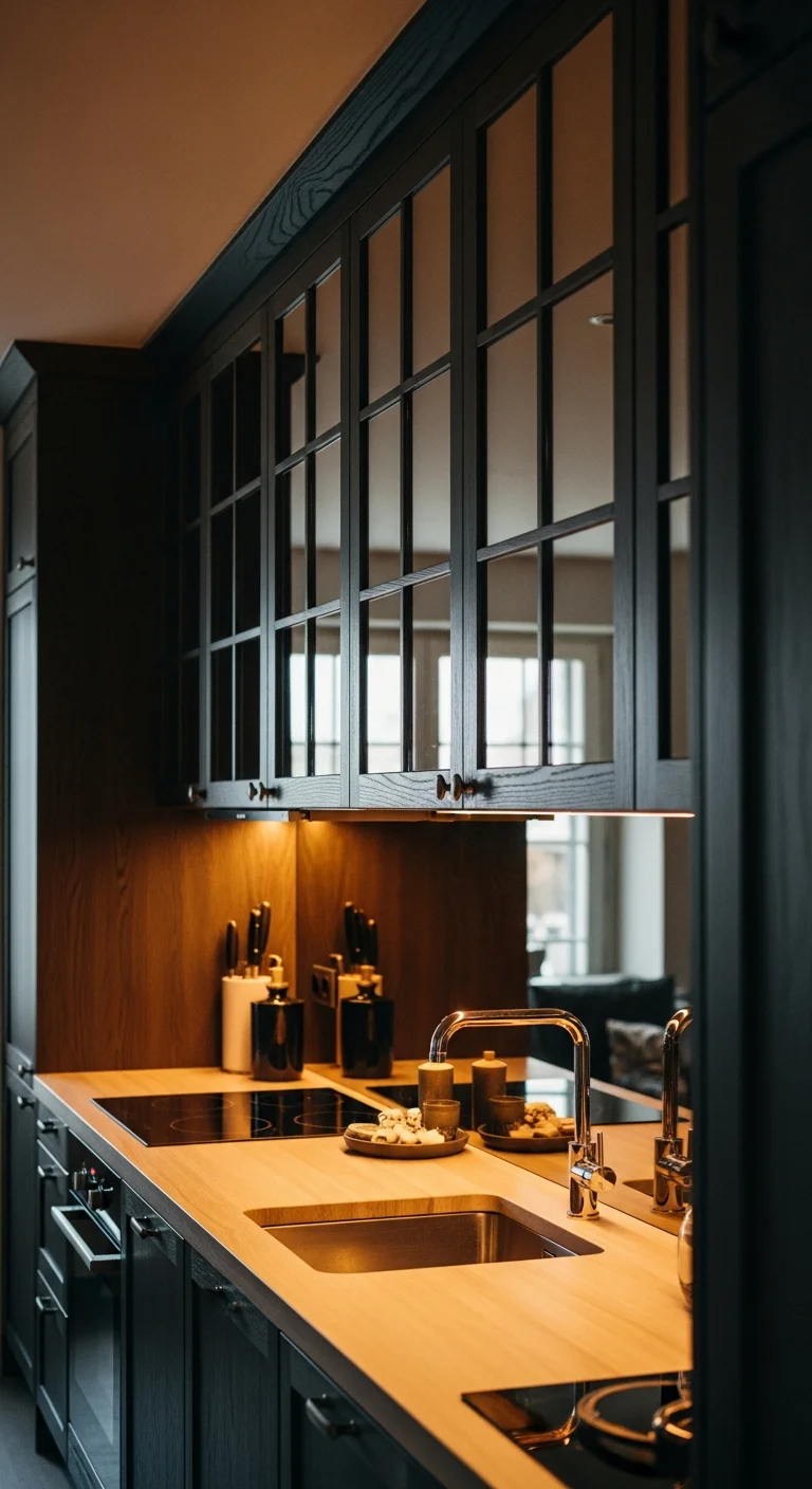 If your kitchen lacks natural light, use mirrored film or custom mirrored panels cut to resemble faux windows above the cabinets. When light hits them, they reflect the space below, making the ceiling seem significantly higher and the room brighter. This highly strategic technique works particularly well in small, dark kitchens, adding depth and visual space without taking up physical room. It provides an unexpected element of architectural detail.