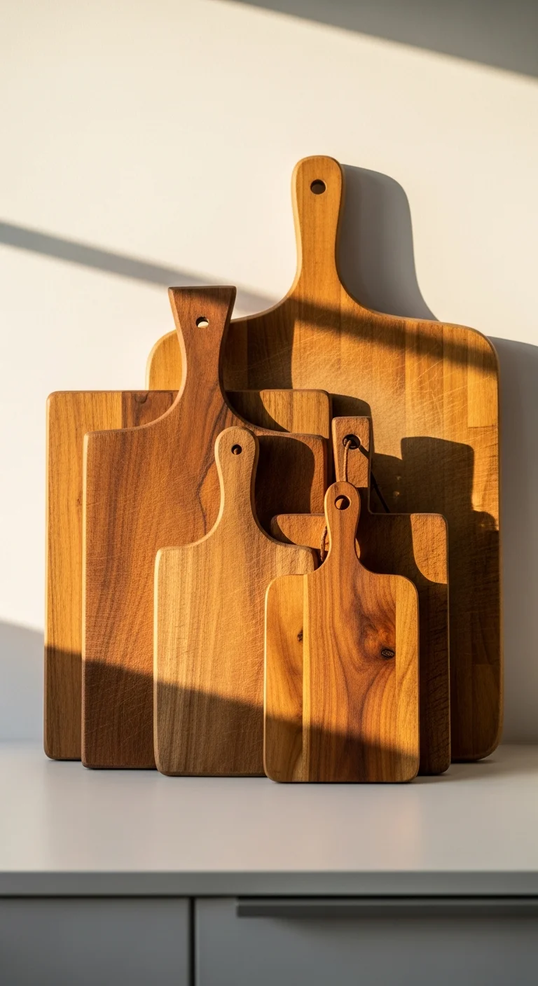 Large wooden cutting boards (especially paddle boards or thick butcher block style) stacked or leaned against the wall provide excellent vertical interest and texture. This brings necessary organic material and warmth to the sometimes sterile environment of cabinet tops. Choose various wood tones like rich walnut, pale maple, and reddish cherry to create a rich, layered effect. This functional display is always highly appealing and suggests a connection to culinary craft.