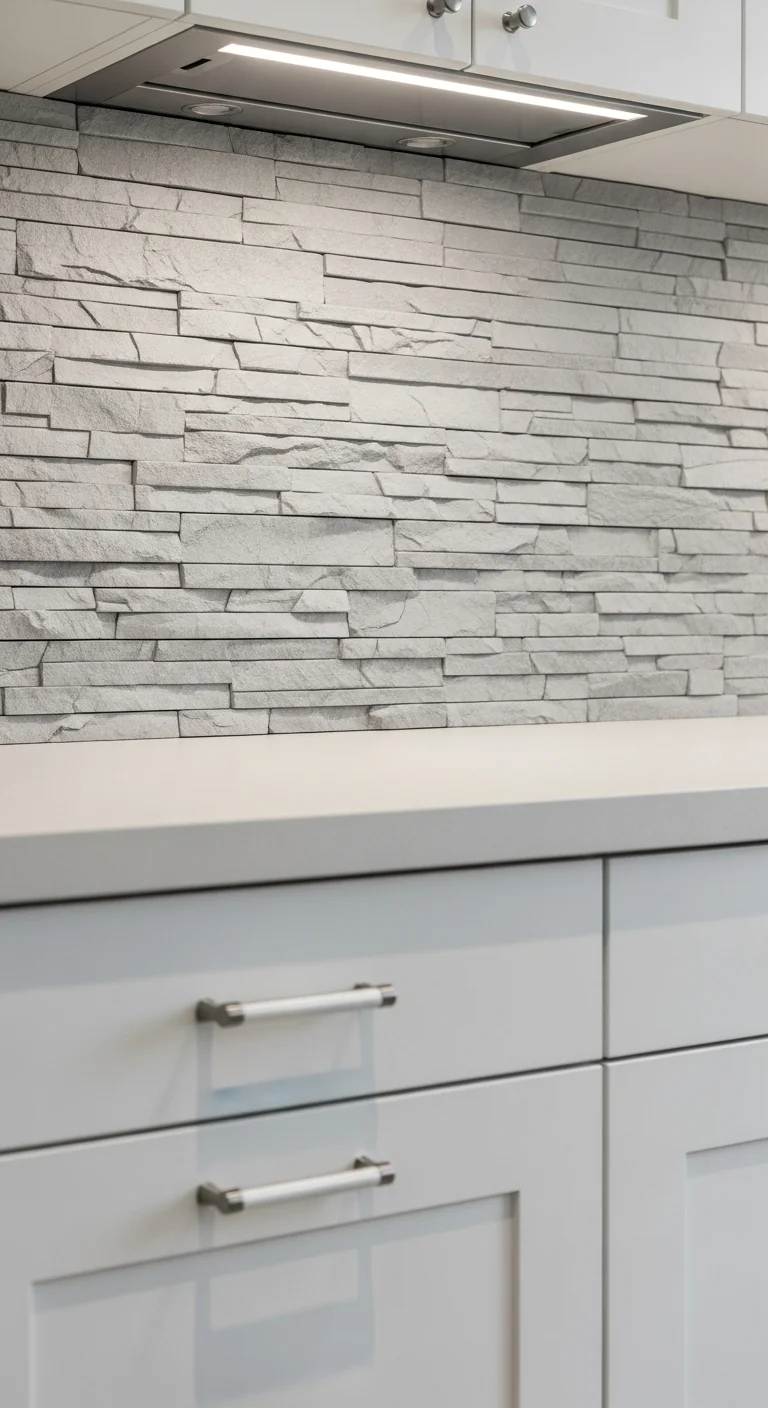 For a permanent, impactful change, consider installing thin faux stone or shiplap veneer on the wall space above the cabinets. This creates a stunning feature wall that adds tremendous depth and texture right up to the ceiling line. The contrast between the smooth cabinet material and the rough stone texture provides substantial visual interest and serves as a natural, rugged backdrop for displaying smaller items like pottery or wooden bowls.