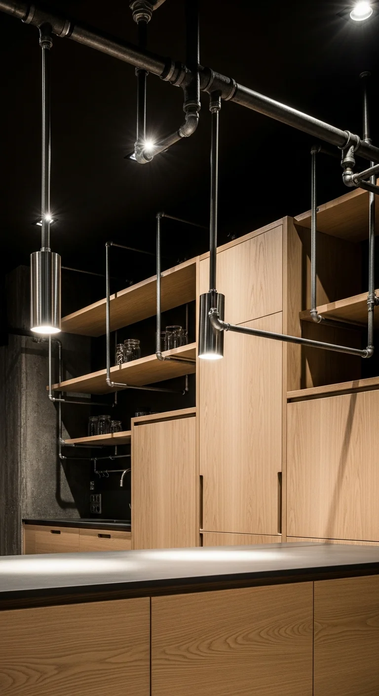 Incorporate industrial flair by placing short sections of decorative metal piping or unique metallic containers above the cabinets. Use dark, rugged metals like matte black or oxidized copper finishes. These elements introduce a rough, urban edge that balances well with sleek, modern cabinets. Pairing them with exposed filament bulbs or industrial gauges further enhances the style and creates a dramatic visual effect that commands attention.