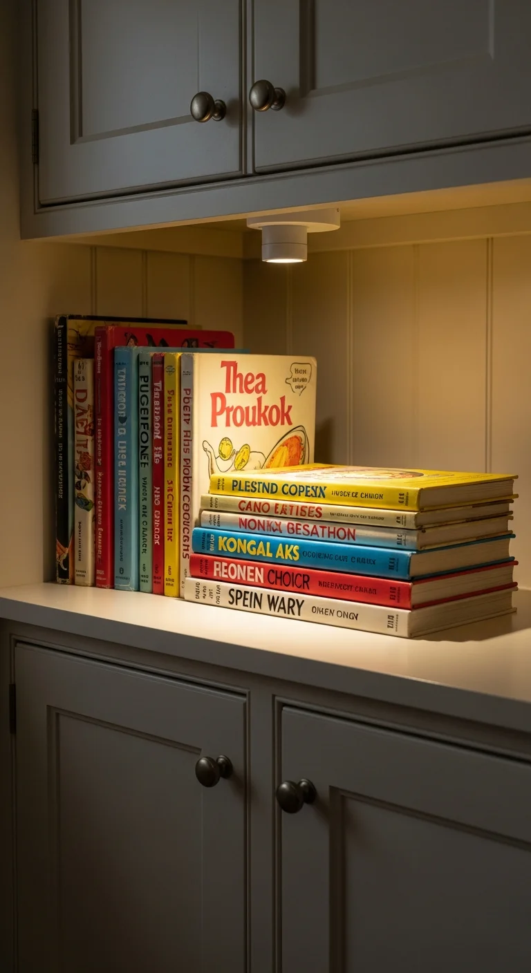 If you are an avid cook, the cabinet tops offer the ideal spot for displaying your collection of cookbooks. Stack them horizontally and vertically, using decorative bookends to prevent slippage. Vary the stack heights to add dynamic visual interest and depth. This functional decor not only looks charming but also provides easy access to your favorite recipes when needed. Use books with brightly colored spines to introduce a vibrant splash of color to an otherwise neutral wall space.