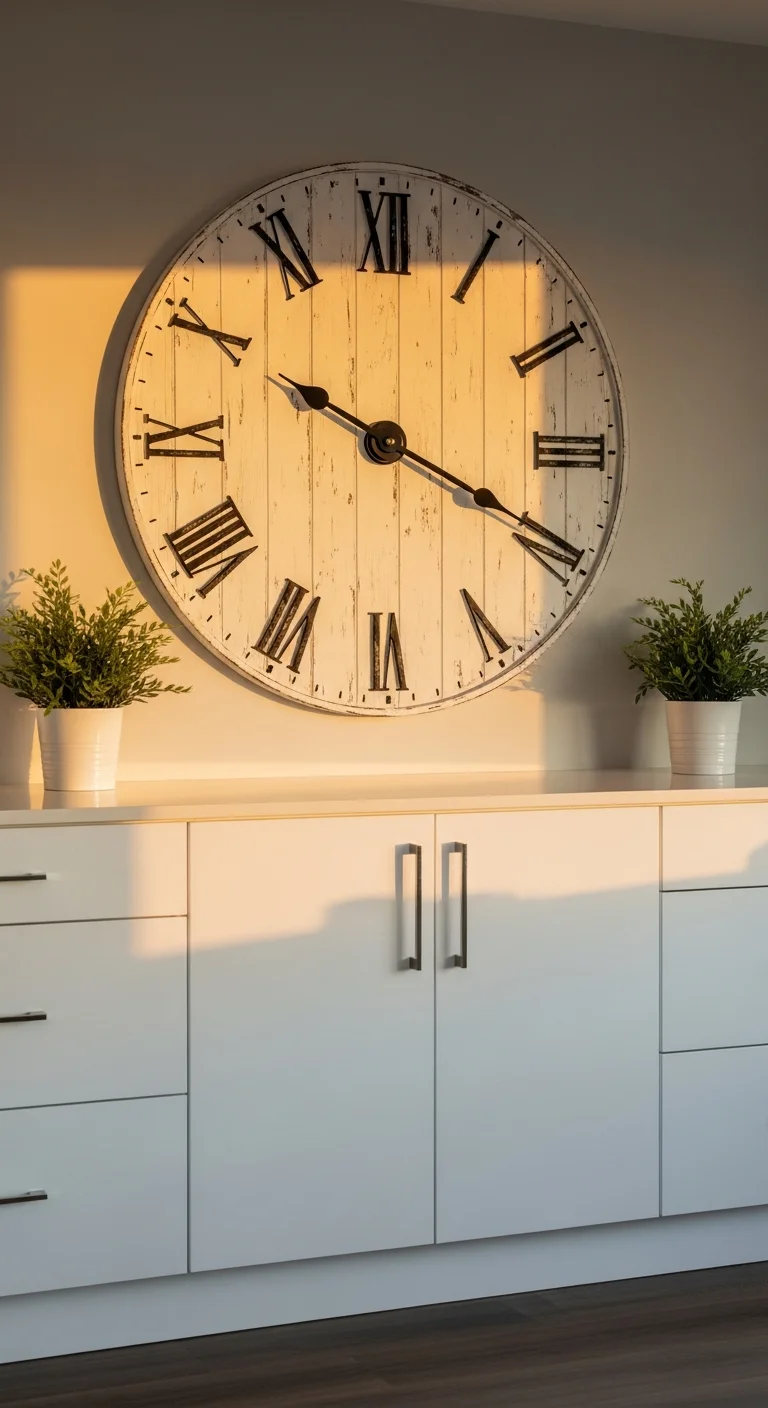 A large, vintage-style clock or custom wooden sign can serve as an impactful focal point above your cabinetry. Choose a size proportionate to the cabinet run to avoid dwarfing the display. If using signage, select witty or kitchen-related phrases that complement your style. This decor choice draws the eye upward and quickly defines the style of the room, adding a playful yet substantial element to the vertical space.