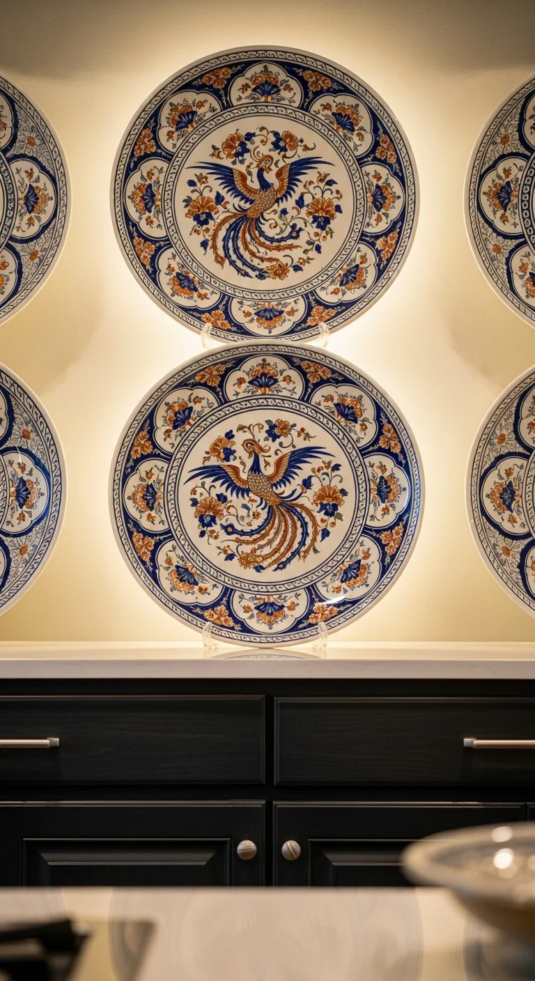 Large decorative serving platters or charger plates can be stood upright using invisible, clear display easels. Look for colorful, patterned ceramics, unique hand-painted designs, or hammered metallic finishes. Vary the sizes and ensure they don’t look crowded on the surface. This idea is particularly effective for showcasing heritage pieces or artisanal items that are too beautiful to be hidden away in drawers below the workspace.