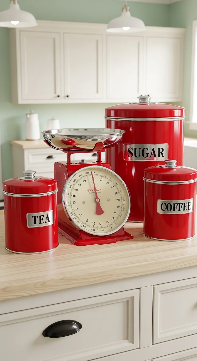 Embrace a nostalgic look by arranging vintage kitchen items such as old balancing scales, classic bread boxes, or matching tin canister sets. Chrome or colorful enamelware pieces provide a charming retro vibe that instantly elevates the space. This arrangement taps into a timeless kitchen aesthetic and adds necessary texture. These items work beautifully when paired with simple greenery or small bundles of dried herbs for contrast.