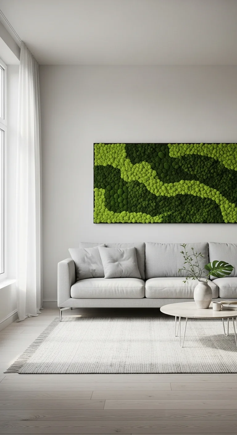 Bring the outdoors in with biophilic design. A preserved moss wall uses real, maintenance-free moss (usually reindeer or sheet moss) arranged into geometric patterns or abstract scenes. It adds immediate texture and a calming, natural green focal point.