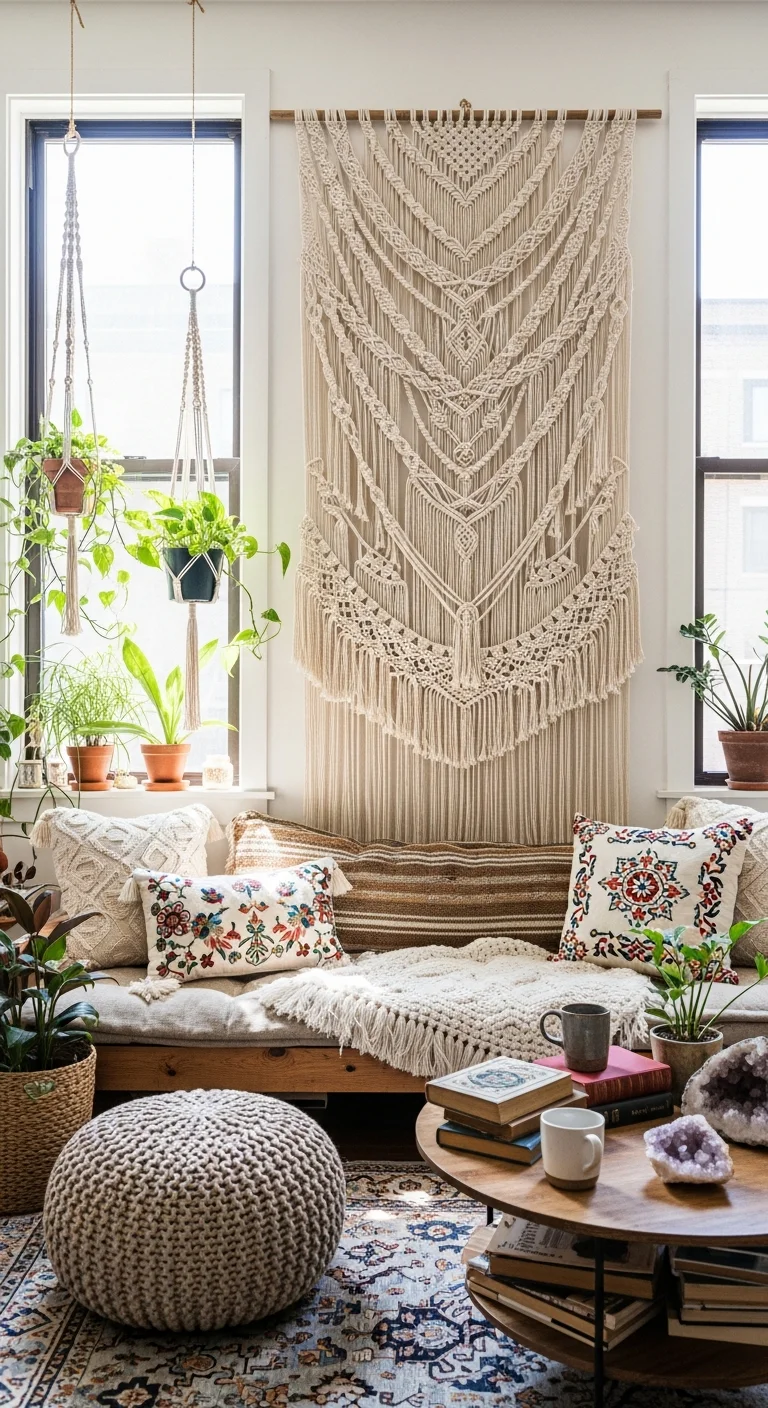A large-scale, hand-knotted macrame piece adds significant bohemian texture and visual weight to a bare wall. Unlike framed art, textile hangings introduce a softness that balances hard architectural lines.