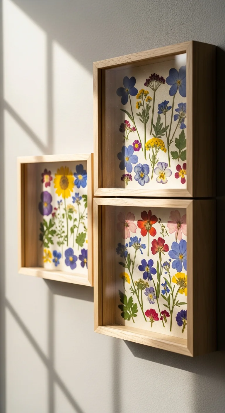 Grouping them in threes or fives helps create a cohesive gallery. You can press flowers yourself or buy professionally curated botanical arrangements in transparent frames.