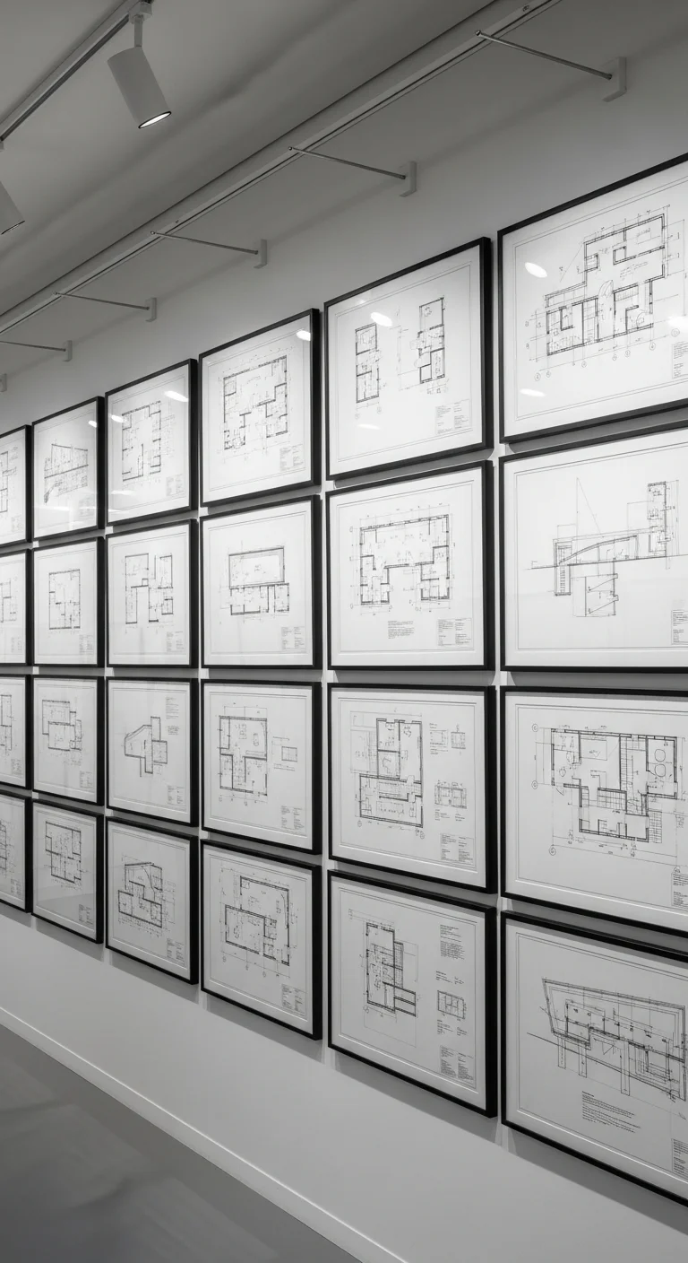 Use consistent black frames and white mats to unify the diverse drawings. The cool tones of blue, white, and black provide an intellectual and refined aesthetic.