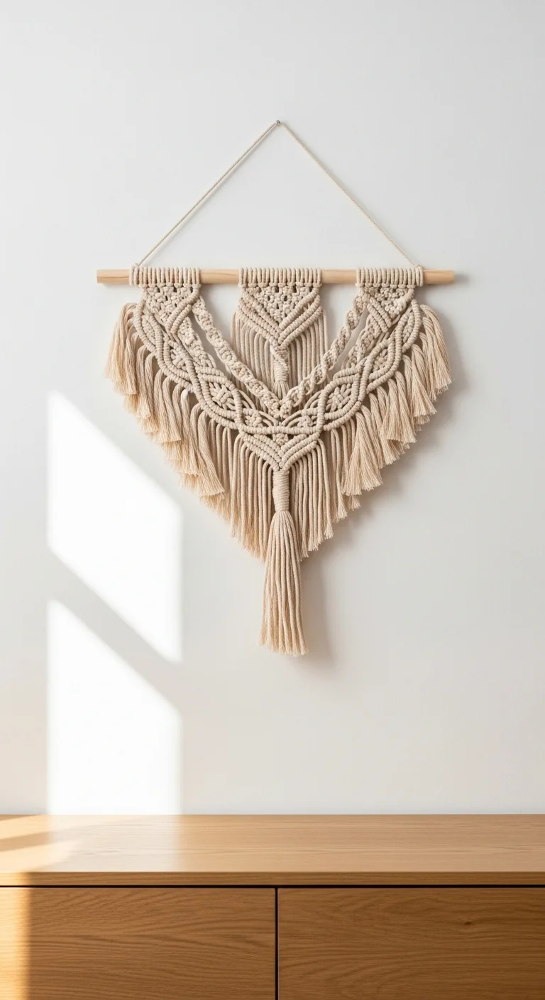Macrame has evolved beyond bohemian maximalism into a chic textural accent. Choose a subtle, geometric macrame wall hanging in a neutral tone like ivory or beige. The intricate knotting adds depth to flat walls and introduces an artisan, handcrafted feel to the space. Hang it above a smaller console table or in a corner reading nook to draw attention to the area. This soft textile art instantly elevates the visual temperature of the room.