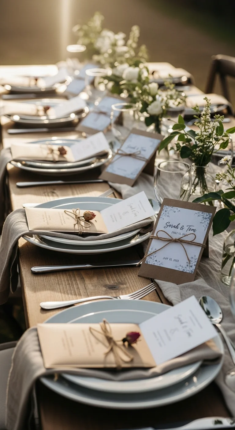 Elevate your place settings by bundling cutlery with natural twine or ribbon. Tuck a sprig of rosemary or a small flower into each bundle for an added touch of freshness and fragrance. This simple detail makes each guest feel special and adds a cohesive, rustic element to your tables. It’s an inexpensive way to infuse charm into every setting.