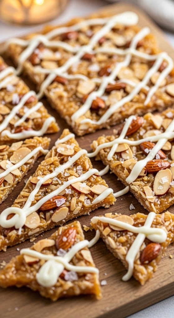 Scatter chopped almonds before the chocolate sets, adding crunch and warmth that balance beautifully with the toffee base. A little almond extract enhances the aroma — a simple touch that feels downright gourmet.