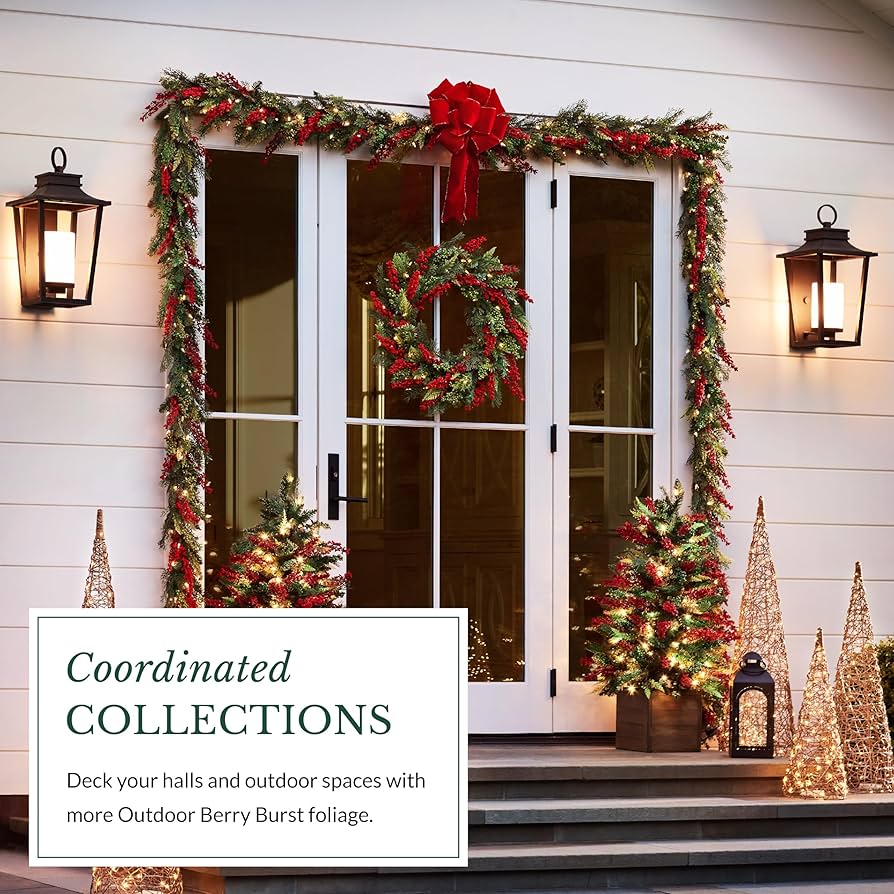 Weave vibrant red berry garlands through railings, around columns, or accent your wreath with berry sprays. The pop of color from artificial or real berries provides a cheerful contrast to traditional evergreens and adds an extra layer of festive beauty. They mimic nature’s winter bounty, bringing a lively and traditional element to your outdoor display. This instantly brightens any green base, creating a wonderful festive atmosphere.