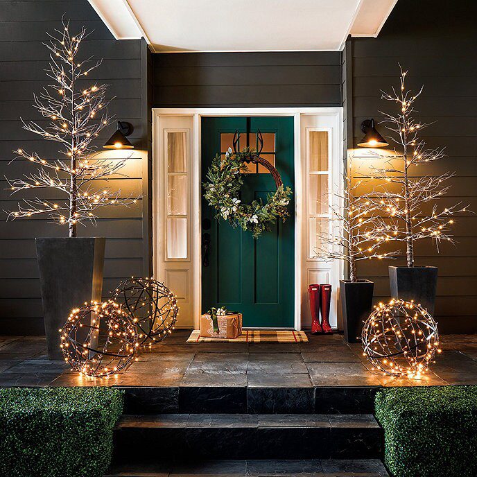 Place large, illuminated outdoor orbs among your planters or on steps. These contemporary lights emit a soft, diffused glow, creating a modern and magical atmosphere. Available in various sizes, they offer a sleek alternative to traditional string lights and can be used to highlight specific areas of your porch. They create a sophisticated and ethereal display, adding a touch of contemporary elegance to your holiday decor.