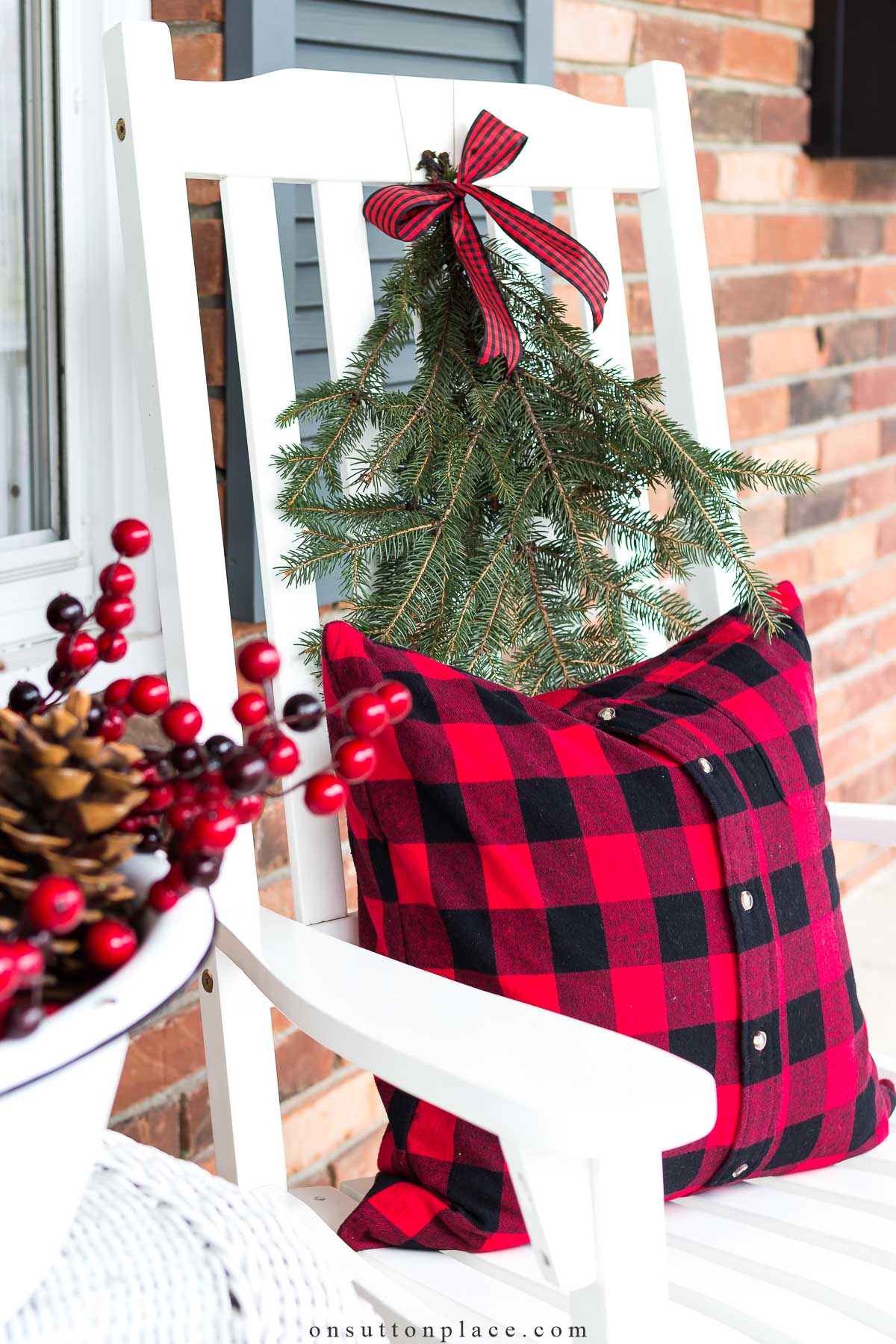 If your porch has seating, drape cozy plaid throws over chairs or benches. This simple touch adds warmth, texture, and a quintessential holiday feel. Choose traditional red and green plaids, or modern black and white buffalo checks. Not only do they look inviting, but they also offer practical comfort for anyone lingering outdoors, creating a welcoming, cabin-like ambiance. For more comfort ideas, see 28 Comfy Lounge Seating Ideas.