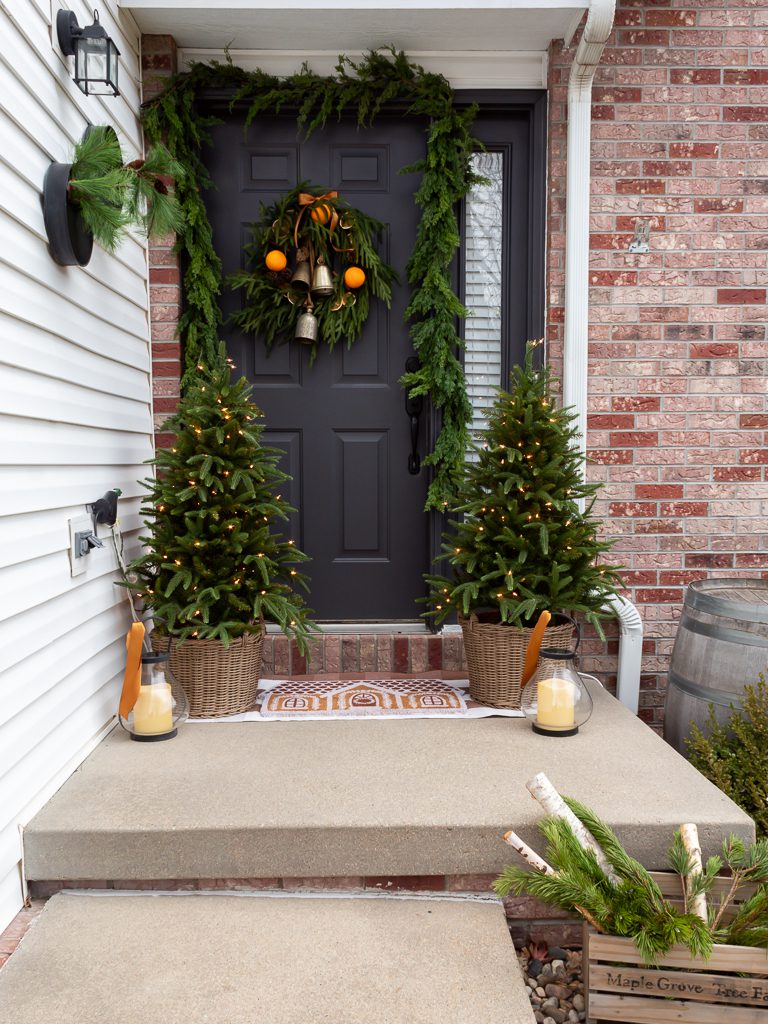 Line your porch steps or entryway with potted evergreen trees or shrubs. Small spruces, junipers, or cedars bring natural greenery and a fresh, wintery scent. Dress them up with miniature lights, simple ornaments, or burlap bows for an elevated festive touch. These plants can often be replanted after the holidays, offering a sustainable decorating choice. They create a beautiful, symmetrical display that enhances curb appeal instantly.
