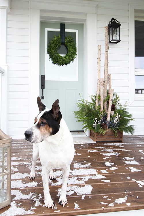 Arrange a bundle of birch logs tied with a festive ribbon in a corner or by the door. The white bark offers a beautiful contrast against green foliage and red accents, adding a natural, wintry element. This simple display brings a touch of rustic elegance and a cozy, cabin-like feel without requiring a fireplace. It’s a visually appealing, sculptural addition to any porch, creating immediate warmth.