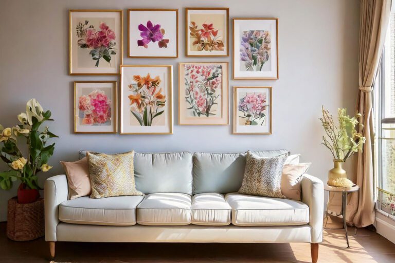 Instructions: 1. Print high-quality images of local wildflowers or green herbs. 2. Carefully place prints into the vintage frames. 3. Use a level to ensure even spacing on your main hallway wall. 4. Arrange in a tight grid pattern. This creates a sophisticated, garden-like atmosphere. It is an affordable way to transform a blank, boring wall into a masterpiece.