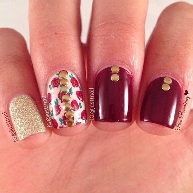 Deep, alluring dark red nails are made even more captivating with a strategic “pop” of gold. This could be a single gold accent nail, a delicate line, or a tiny charm, adding a touch of luxury and warmth to the rich red hue.