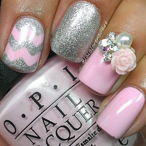 Delicate light pink paired with shimmering silver creates a soft yet dazzling nail design. This combination is perfect for a subtle sparkle, adding a touch of romance and glamour to your fingertips without being overly bold. Think fine silver lines or glitter accents.