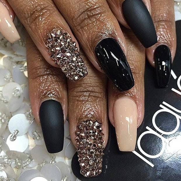 This design flawlessly blends edgy matte black, subtle nude, and luxurious gold details for a high-fashion statement. The contrast in textures and colors creates an intriguing and sophisticated look, perfect for those who appreciate modern elegance with an edge.