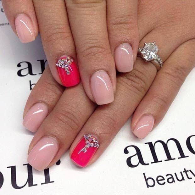 Add a dazzling focal point to your manicure with a pink rhinestone accent nail. This design transforms a simple pink manicure into something truly special, catching the light and adding a luxurious sparkle, perfect for making a statement.