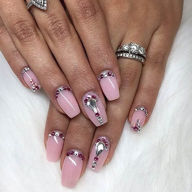 Elevate classic light pink nails with the dazzling addition of rhinestones. This combination offers a touch of glam and sparkle, making your manicure feel instantly more luxurious and special, ideal for events or simply adding a bit of everyday sparkle.