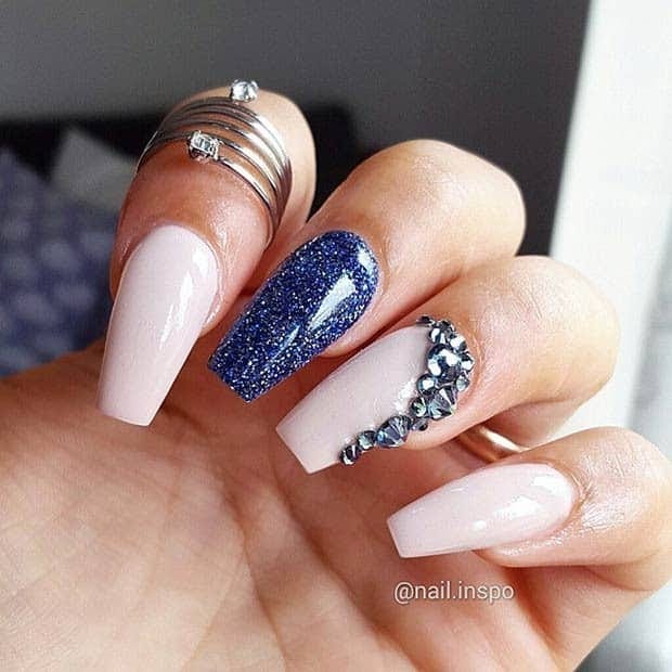 Sophisticated and modern, nude and dark blue coffin nails strike a perfect balance between classic elegance and contemporary edge. The versatile nude provides a perfect base for a rich, deep blue accent, often styled with geometric patterns or a single bold stripe.