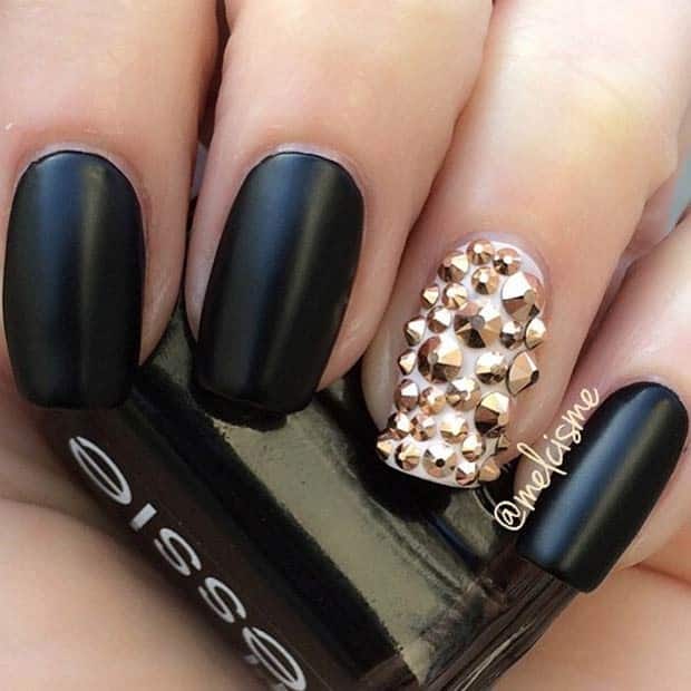 Sophisticated and striking, this design plays with contrasts: the edgy depth of black, the understated elegance of nude, and a luxurious pop of gold. Whether it’s geometric lines, abstract shapes, or a single gold stud, this combination is incredibly chic.