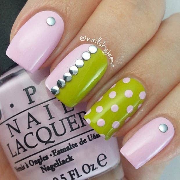 A surprisingly harmonious pair, light pink and green nails evoke a fresh, whimsical, and natural aesthetic. Think delicate floral patterns, abstract art, or color-blocking with soft mints, olive greens, and blush pinks for a charming and unique manicure.